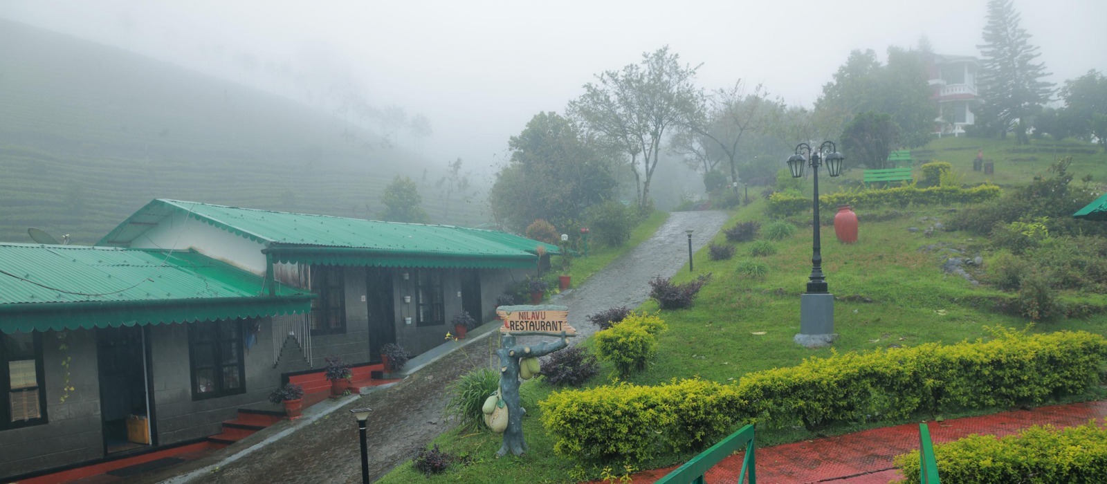 The resort sits in the hills of Munnar, Kerala. It overlooks lush valleys and tea gardens.